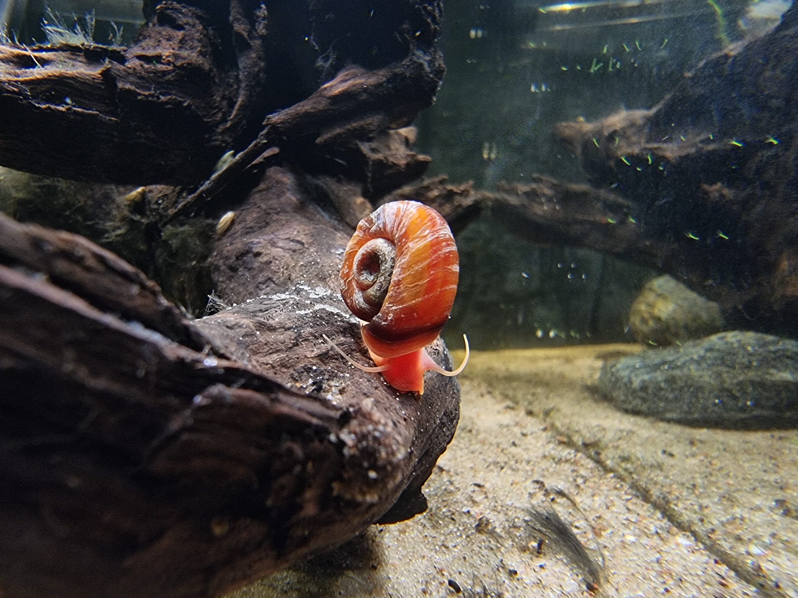 Kuvassa punainen kiekkokotilo, joka sopii myös pieniin nanoaltaisiin. Kotilot ja sukaravut ovat herkkiä vesiarvojen muutoksille, joten niiden totuttaminen uuteen kotiin tehdään hitaasti.